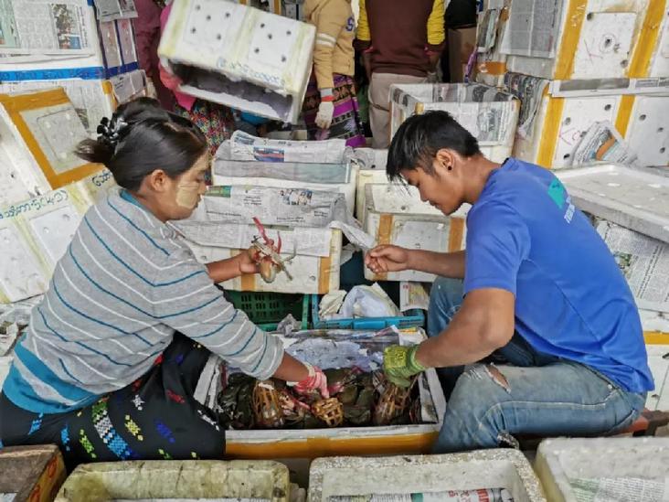 ▲1月3日,工作人員在云南省畹町水產(chǎn)品交易市場(chǎng)分揀來(lái)自緬甸的螃蟹。新華社記者姚兵攝