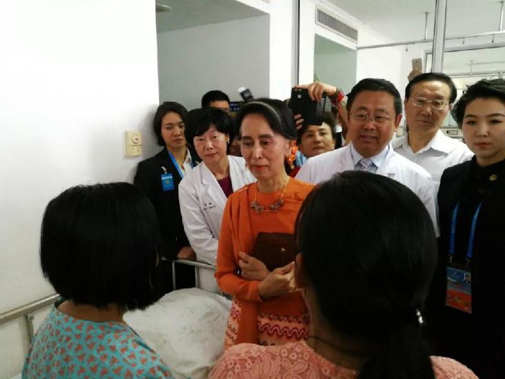 ▲2017年5月16日,緬甸國(guó)務(wù)資政昂山素季來(lái)到北京安貞醫(yī)院看望受救助在京做手術(shù)的緬甸先心病患兒。她在北京出席首屆“一帶一路”國(guó)際合作高峰論壇。新華社記者李雪笛攝