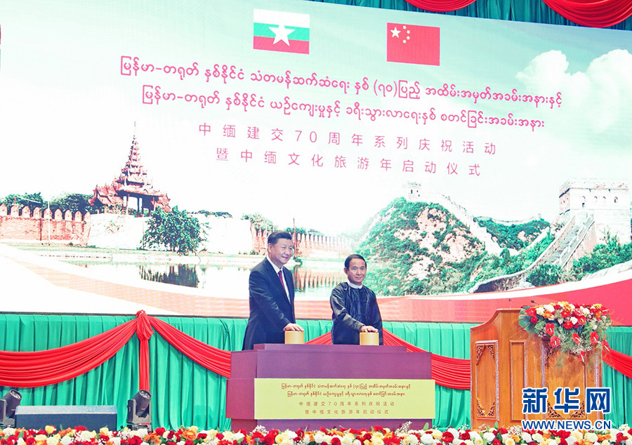 當?shù)貢r間1月17日晚,國家主席習近平在內(nèi)比都第二國際會議中心出席中緬建交70周年慶?;顒郁咧芯捨幕糜文陠觾x式。這是習近平和緬甸總統(tǒng)溫敏共同按下按鈕,正式啟動中緬文化旅游年。 新華社記者 黃敬文 攝