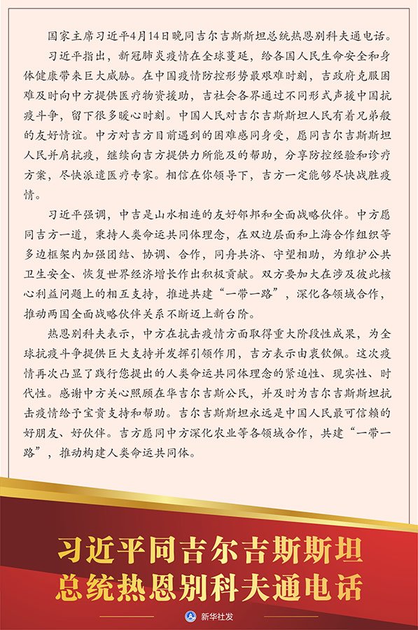 習(xí)近平指出,新冠肺炎疫情在全球蔓延,給各國(guó)人民生命安全和身體健康帶來(lái)巨大威脅。在中國(guó)疫情防控形勢(shì)最艱難時(shí)刻,吉政府克服困難及時(shí)向中方提供醫(yī)療物資援助,吉社會(huì)各界通過不同形式聲援中國(guó)抗疫斗爭(zhēng),留下很多暖心時(shí)刻。中國(guó)人民對(duì)吉爾吉斯斯坦人民有著兄弟般的友好情誼。中方對(duì)吉方目前遇到的困難感同身受,愿同吉爾吉斯斯坦人民并肩抗疫,繼續(xù)向吉方提供力所能及的幫助,分享防控經(jīng)驗(yàn)和診療方案,盡快派遣醫(yī)療專家。相信在你領(lǐng)導(dǎo)下,吉方一定能夠盡快戰(zhàn)勝疫情。