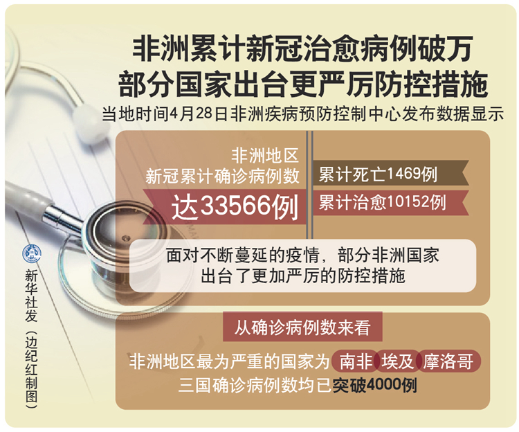 新華社洛美4月28日電 綜合新華社駐非洲地區(qū)記者報道:非洲疾病預防控制中心28日發(fā)布數(shù)據(jù)顯示,非洲地區(qū)新冠累計確診病例數(shù)達33566例,累計死亡1469例,累計治愈10152例。面對不斷蔓延的疫情,部分非洲國家出臺了更加嚴厲的防控措施。