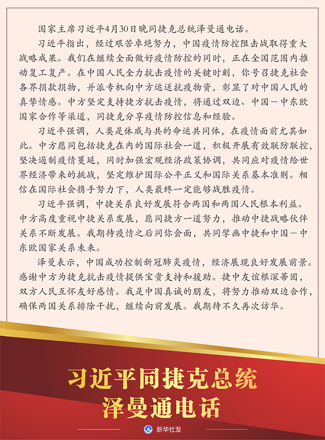 習(xí)近平指出,經(jīng)過艱苦卓絕努力,中國疫情防控阻擊戰(zhàn)取得重大戰(zhàn)略成果。我們在繼續(xù)全面做好疫情防控的同時,正在全國范圍內(nèi)推動復(fù)工復(fù)產(chǎn)。在中國人民全力抗擊疫情的關(guān)鍵時刻,你號召捷克社會各界捐款捐物,并派專機向中方運送抗疫物資,彰顯了對中國人民的真摯情感。中方堅定支持捷方抗擊疫情,將通過雙邊、中國-中東歐國家合作等渠道,同捷克分享疫情防控信息和經(jīng)驗。