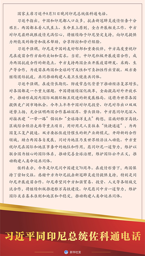 習近平指出,中國和印尼都人口眾多,抗擊新冠肺炎疫情任務十分艱巨。兩國都本著人民至上、生命至上原則,全力開展相關工作。中方對印尼最終戰(zhàn)勝疫情充滿信心,將繼續(xù)給予印尼堅定支持,向印尼提供力所能及的物資和技術幫助,分享防控和診療經(jīng)驗。