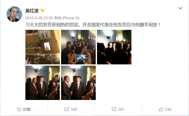 時(shí)任聯(lián)合國(guó)副秘書長(zhǎng)吳紅波說,習(xí)主席走下講臺(tái)時(shí),二三十位其他國(guó)家領(lǐng)導(dǎo)人排隊(duì)與他握手表示祝賀,走廊里擠得滿滿當(dāng)當(dāng)。