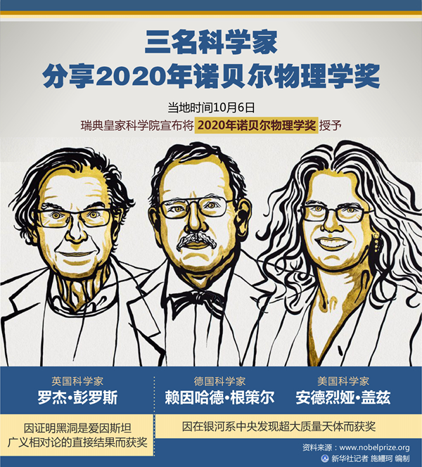 新華社斯德哥爾摩10月6日電(記者和苗 付一鳴)瑞典皇家科學(xué)院6日宣布,將2020年諾貝爾物理學(xué)獎(jiǎng)授予三名科學(xué)家。英國科學(xué)家羅杰·彭羅斯因證明黑洞是愛因斯坦廣義相對(duì)論的直接結(jié)果而獲獎(jiǎng);德國科學(xué)家賴因哈德·根策爾和美國科學(xué)家安德烈婭·蓋茲因在銀河系中央發(fā)現(xiàn)超大質(zhì)量天體而獲獎(jiǎng)。