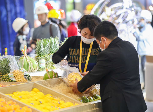 11月2日,在食品及農(nóng)產(chǎn)品展區(qū),一企業(yè)展臺(tái)的工作人員在擺放展品。連日來,第三屆中國國際進(jìn)口博覽會(huì)舉辦地國家會(huì)展中心(上海)內(nèi)一派忙碌景象,各個(gè)展館的搭建和布置工作正有條不紊地進(jìn)行。新華社記者 丁汀 攝