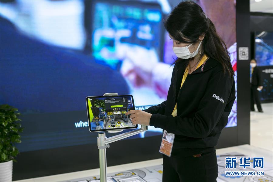 11月5日,在第三屆進博會服務貿(mào)易展區(qū),德勤公司在中國首發(fā)“德勤小黃鴨智能工廠”,工作人員通過AR(增強現(xiàn)實)技術展示智能工廠的應用場景。 新華社記者 王翔 攝
