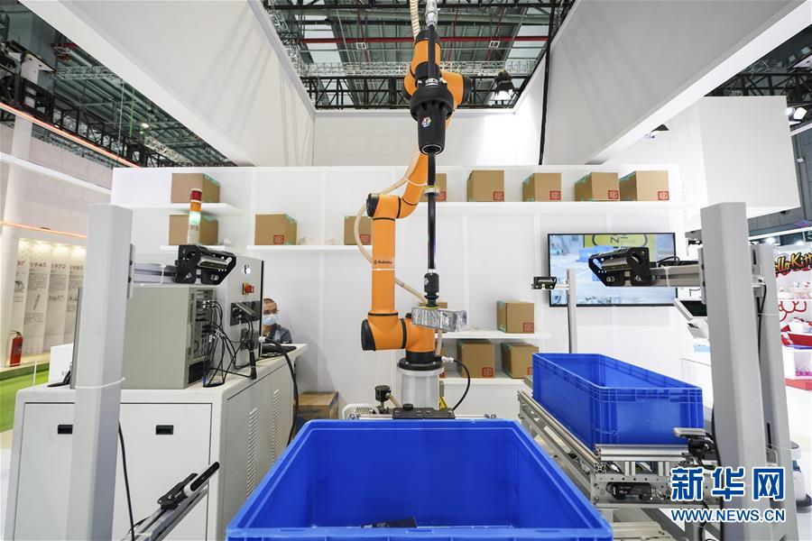 11月5日在第三屆進博會服務貿(mào)易展區(qū)拍攝的物流分揀機器人。新華社記者 張豪夫 攝