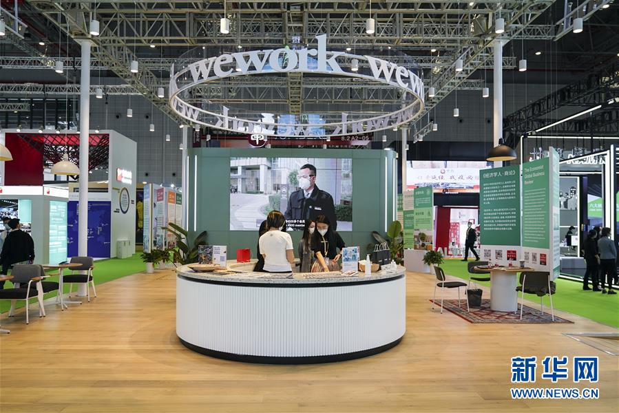 11月5日拍攝的第三屆進博會服務貿(mào)易展區(qū)wework展臺。 新華社記者 張豪夫 攝