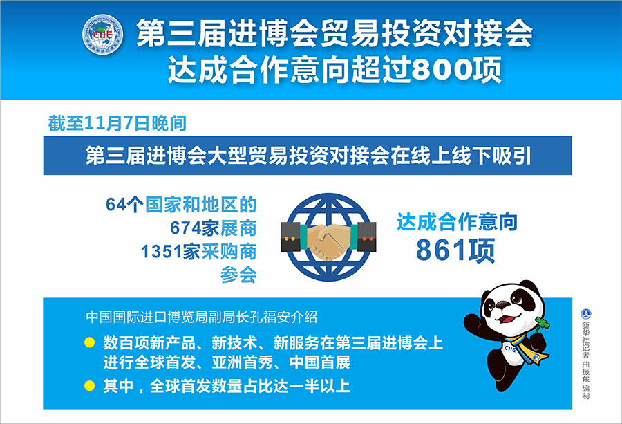 新華社上海11月8日電(記者周蕊、于佳欣)記者8日從第三屆中國國際進口博覽會展中新聞通氣會上了解到,截至7日晚間,第三屆進博會大型貿(mào)易投資對接會在線上線下吸引64個國家和地區(qū)的674家展商、1351家采購商參會,達成合作意向861項。