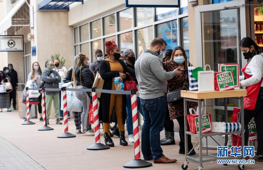 11月27日,人們在美國馬里蘭州國家港灣一處購物中心排隊等待進(jìn)店購物。