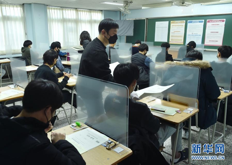 12月3日,在韓國京畿道城南市,監(jiān)考人員在某考點向考生分發(fā)試卷。新華社發(fā)(李相浩 攝)