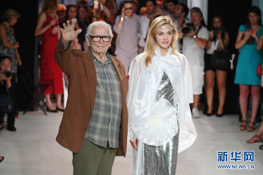 這張資料照片顯示,2016年7月9日,在法國普羅旺斯博尼約舊火車站臨時搭建的秀場里,皮爾·卡丹(左)在時裝秀結(jié)束時向觀眾揮手致意。新華社記者李根興攝