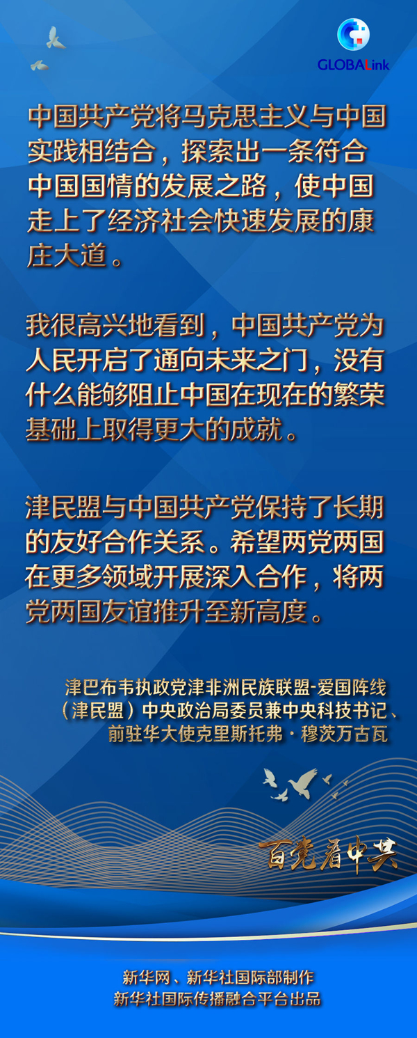 “我很高興地看到,中國共產(chǎn)黨為人民開啟了通向未來之門,沒有什么能夠阻止中國在現(xiàn)在的繁榮基礎(chǔ)上取得更大的成就。”穆茨萬古瓦說,津民盟和他本人對中國共產(chǎn)黨帶領(lǐng)中國人民所取得的偉大成就表示贊嘆,祝愿中國在未來取得更大的發(fā)展成就。他希望兩黨兩國在更多領(lǐng)域開展深入合作,將兩黨兩國友誼推升至新高度。
