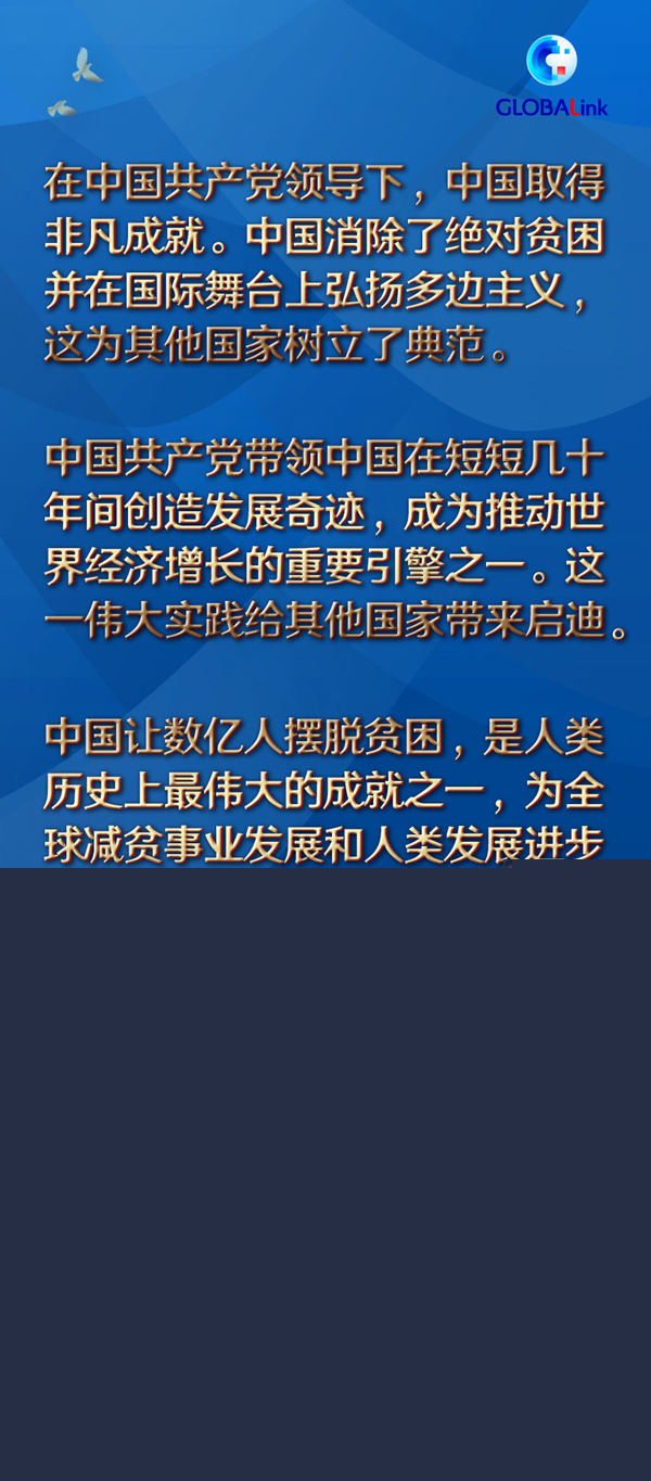 “新中國(guó)成立之時(shí),中國(guó)還很貧窮。中國(guó)共產(chǎn)黨帶領(lǐng)中國(guó)在短短幾十年間創(chuàng)造發(fā)展奇跡,成為推動(dòng)世界經(jīng)濟(jì)增長(zhǎng)的重要引擎之一。這一偉大實(shí)踐給其他國(guó)家?guī)?lái)啟迪。”