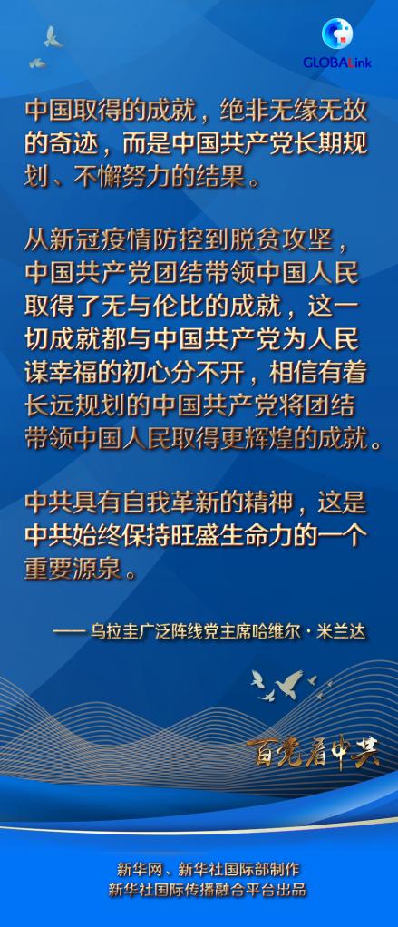 今年是中國共產(chǎn)黨建黨百年,米蘭達(dá)代表烏拉圭廣泛陣線黨表示熱烈祝賀。他表示,中共具有自我革新的精神,這是中共始終保持旺盛生命力的一個(gè)重要源泉。