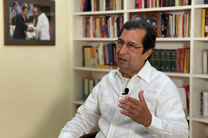 4月1日,委內(nèi)瑞拉統(tǒng)一社會(huì)主義黨副主席、委內(nèi)瑞拉駐古巴大使阿丹·查韋斯在古巴首都哈瓦那接受采訪(fǎng)。新華社發(fā)(委內(nèi)瑞拉駐古巴使館供圖)