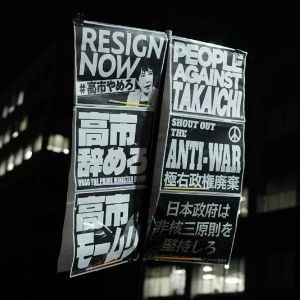 2025年11月21日,在日本东京的首相官邸外,民众手持标语参加抗议活动,要求日本首相高市早苗撤回错误言论。新华社记者 贾浩成 摄